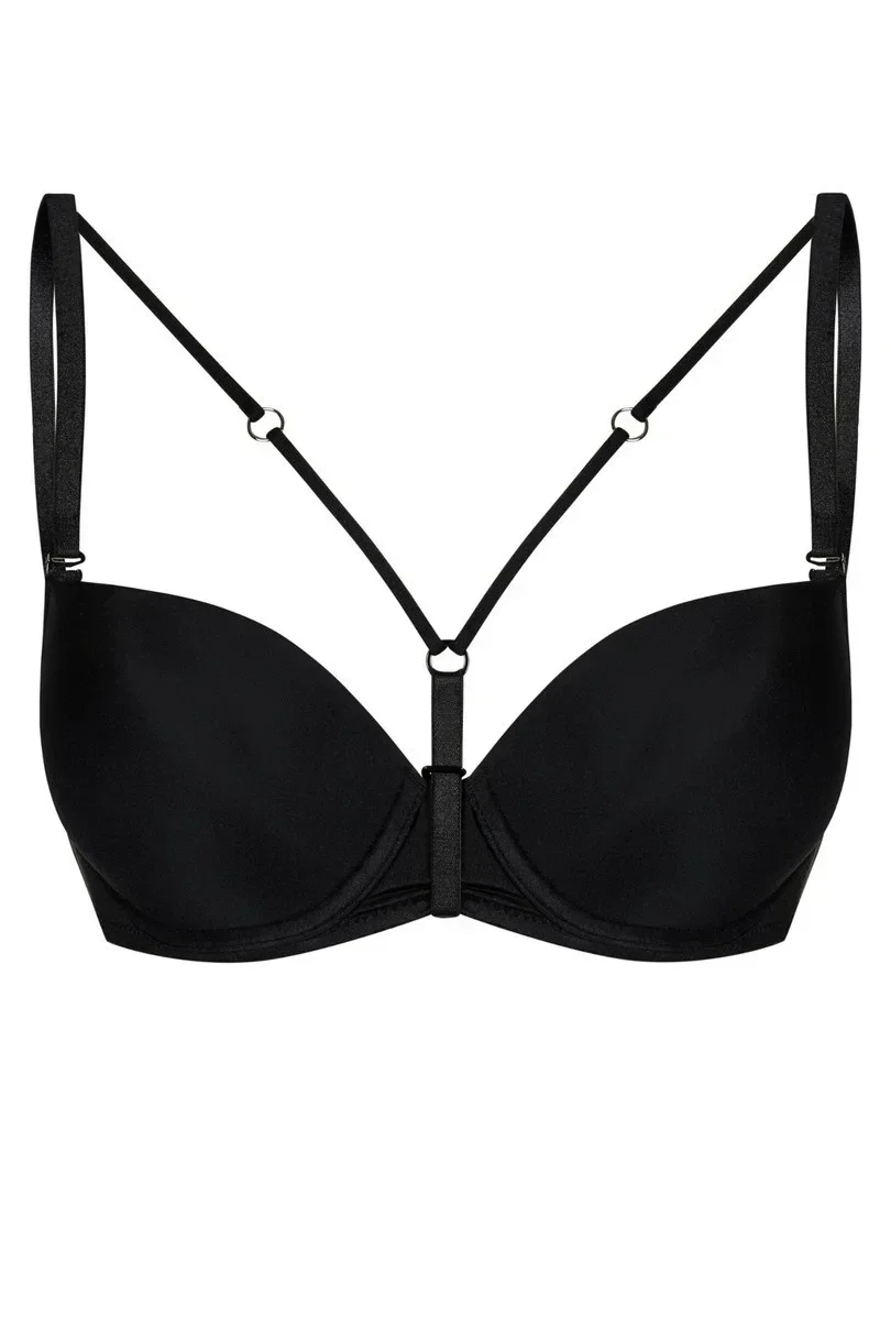 Ozdobná ramínka v černé barvě. Jednoduše odepněte ramínka z podprsenky, připevněte ramínka DECOLLETE k podprsence tak, aby byl regulátor délky vzadu, přejeďte zapínacím páskem shora kolem můstku mezi košíčky, konec pásku zahákněte do tunýlku pod kroužkem. Upravte ramínka a délku pásku kolem můstku, nastavte je tak, abyste se cítila pohodlně a ramínka DECOLLETE dobře seděla, a je hotovo.