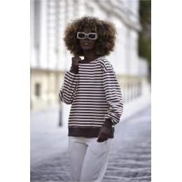 Bluza Riana to doskonały wybór dla kobiet, które cenią sobie modę i wygodę każdego dnia. Dzięki luźnemu krojowi z delikatnym efektem oversize oraz obniżonej linii ramion, zapewnia pełną swobodę ruchu i modny, nonszalancki wygląd. Ściągacze przy rękawach, dekolcie i w pasie dodają jej sportowego charakteru, jednocześnie podkreślając sylwetkę. Wzór w subtelne paski oraz miękki, przyjemny w dotyku materiał sprawiają, że bluza sprawdzi się zarówno w stylizacjach domowych, jak i miejskich. Idealnie komponuje się z jeansami lub spodniami dresowymi, tworząc wygodny i stylowy look.