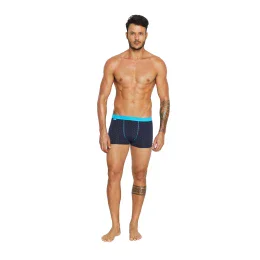 Sada 2 pánských boxerek v tmavě modré barvě, jedny pruhované, druhé puntíkované, oboje lemované kontrastní nití. Měkký bavlněný úplet, hladký elastický pas, složení: 95 % bavlna, 5 % elastan.