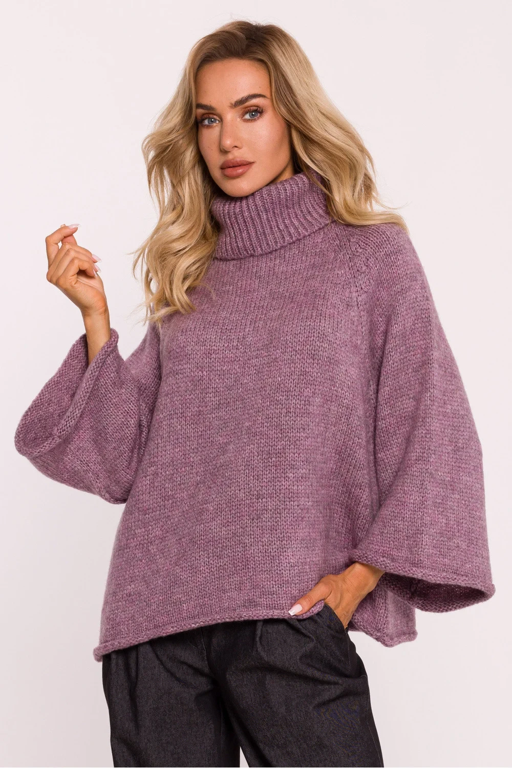 Svetr s rolákem z měkké vlasové příze poskytuje výjimečné pohodlí a teplo. Svetr nadměrné velikosti přes hlavu s volným střihem, který zaručuje volnost pohybu a stylový vzhled. Široké rukávy v délce 7/8 dodávají svetru lehce nonšalantní nádech, ideální pro módní ležérní vzhled. Svetr byl navržen a ušit v Polsku, což svědčí o důrazu na detail a nejvyšší kvalitu zpracování.