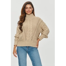 Dámský svetr v hrubé vazbě s kostkovanými prvky, které se táhnou podél svetru a rukávů a dodávají mu originální nádech. Model má vysoký rolák, který poskytuje ochranu před chladem. Design doplňuje jemný prolamovaný vzor, který umožňuje netradiční a jedinečný styling. Spodní část a rukávy mají žebrované lemy pro lichotivý střih. Dlouhé volné rukávy jsou pohodlné, maskují masivní ramena a opticky prodlužují paže. Model sahá až k linii boků a má mírně nadměrný střih, takže je pohodlný a ideální pro chladnější dny. Jeho klasické barvy umožňují sladit ho s mnoha outfity. Skvěle se hodí na každodenní vycházky, zejména v kombinaci s džínami nebo legínami. Jedinečnost tohoto svetru spočívá v tom, že kombinuje ženskost a pohodlí.