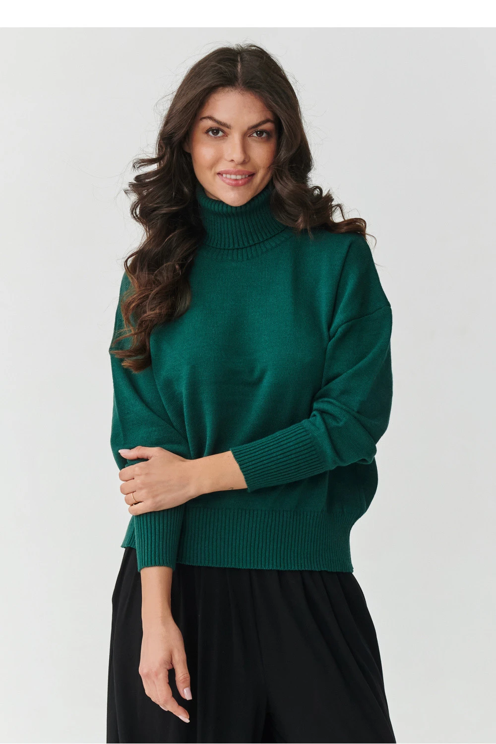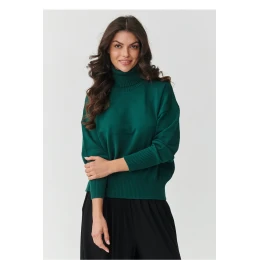 Vsadíte na eleganci a pohodlí v tom nejlepším provedení. Tato dámská svetr s golfovým límcem je must-have v každém šatníku. Vyrobený z vysoce kvalitní pleteniny s unikátním složením 51% viskózy, 30% PBT a 19% nylonu, zaujme svou měkkostí, pružností a odolností. Díky převaze viskózy je svetr velmi příjemný na dotek, umožňuje kůži dýchat a krásně se přizpůsobuje postavě. Příměs syntetických vláken zabraňuje deformacím materiálu, udržuje svůj tvar i po mnoha praních a nekouše se, co zaručuje dlouhou životnost produktu. Proč si vybrat tento model? Klasický golfový límec chrání před chladem a dodává eleganci, ideální na podzim a zimu. Oversize střih s jemně sníženou linií ramen zajišťuje volnost pohybů a pohodlí nošení. Elastické manžety na rukávech a spodním okraji svetru dodávají celku módní charakter. Univerzální design se skvěle hodí jak do každodenních, casual stylizací, tak do elegantních outfitů do práce nebo na schůzky. Skvěle ladí s klasickými džíny, elegantními látkovými kalhotami nebo plisovanou sukní. Můžete jej nosit jak s kotníkovými botami, tak s sportovními teniskami vždy vypadá stylově. Pokud hledáte svetr, který spojí pohodlí, kvalitu a nadčasový styl, tento model s golfovým límcem bude vaším oblíbeným kouskem šatníku po mnoho sezón.
