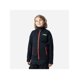 Chlapecká druhá vrstva, která je ideální pro zahřátí v chladných nebo větrných dnech na horách, je celorozepínací fleecová bunda Rossignol Hero Clim Fleece Jacket vyrobená z měkké, pružné tkaniny střední gramáže, takže neomezuje v pohybu a velmi pohodlně se nosí. Záložka kryjící horní část zipu zabraňuje odírání a má dvě boční kapsy na zip. Je praktická a teplá a hodí se pro všechna čtyři roční období.