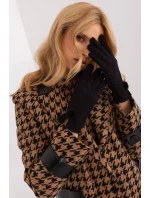 Elegantní dámské rukavice ze zateplené tkaniny s ozdobným geometrickým vzorem. Ozdobné bambulky na zápěstí. Ukazováček s vyšívanou květinou, který umožňuje ovládat telefon bez nutnosti sundávat rukavice.