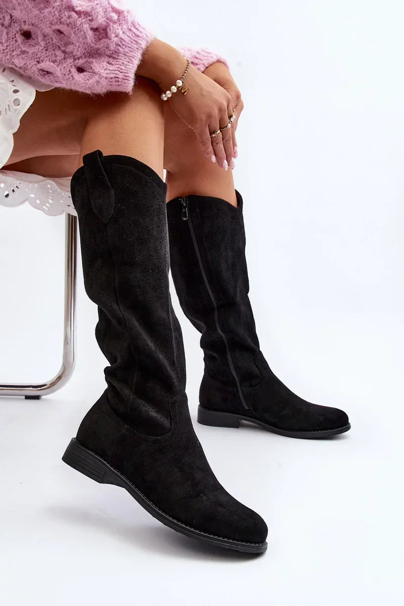 Dámské prolamované kozačky skvěle doplní téměř každý každodenní styling! Vyrobeno z ekologického semiše. Nasazené na plochém stabilním podpatku. Zaoblené prsty. Svršek nad kolena, zapínání na zip. Tento model má navíc vyztuženou patu. Rozhodně byste je měli mít!Při výběru velikosti se řiďte tabulkou velikostí.