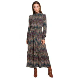100% wiskoza Maximální pohodlí, maximální elegance v podobě maxi šatů s aztéckým potiskem s volánkovým spodním lemem a stojáčkem. Nejlépe doplněné vysokými botami. DETAILY PRODUKTU: tkaná látka s potiskem maxi šaty se stojáčkem a volánkovým spodním lemem skrytý zip na zádech dlouhé rukávy s manžetami na knoflíky naše modelka měří 174 cm a nosí velikost S