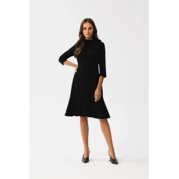 65% polyester 30% wiskoza 5% elastan DETAILY PRODUKTU: šaty z tkané látky se stojáčkem a zavazováním 3/4 rukávy délka ke kolenům volánkový spodní lem bez podšívky skrytý zip na zádech naše modelka měří 174 cm a nosí velikost S navrženo a vyrobeno v Polsku