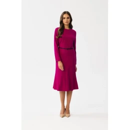 65% polyester 30% wiskoza 5% elastan PODROBNOSTI O PRODUKTU: šaty z tkané látky s ozdobnými svislými záševky v přední části dlouhé rukávy přezka pásek z umělé kůže součástí balení délka pod kolena a šikmý střih sukně bez podšívky skrytý zip na zádech naše modelka je vysoká 174 cm a nosí velikost S navrženo a vyrobeno v Polsku