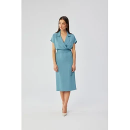 95% polyester 5% elastan PODROBNOSTI O PRODUKTU: košilové šaty z tkané látky s límečkem zavinovací vršek s krátkými netopýřími rukávy tužková sukně střední délky částečně elastický pas délka pod kolena rozparky na zádech nepodšitý pásek na zavázání naše modelka je 176 cm vysoká a nosí velikost S navrženo a vyrobeno v Polsku