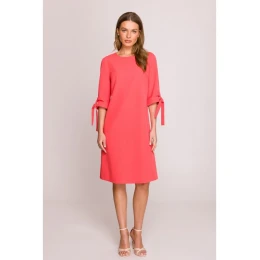 S393 Šaty áčkového střihu s vázacími rukávy - korálová barva