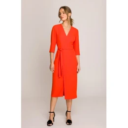 S396 Šaty se zavinovacími detaily ve střední délce - korálová barva