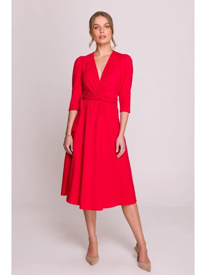 S404 Úpletové šaty s vázacím páskem - červené