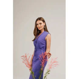 65% polyester 30% wiskoza 5% elastan LÁTKA Materiál: hladká, lehce elastická tkanina se saténovým povrchem PODROBNOSTI O PRODUKTU Výstřih: výstřih do V s detailem zavazování Rukávy: bez rukávů Zapínání: skrytý boční zip Kapsy: žádné Podšívka: žádná Doplňky: látkový pásek se sponou v pase Rozparky: boční rozparky Model: S410 Navrženo a vyrobeno v Polsku Modelka je vysoká 170 cm a má na sobě velikost S STYL A STŘIH Střih: rovný s jemně zvýrazněným pasem Tvar: lehká áčková silueta Délka: midi, pod kolena