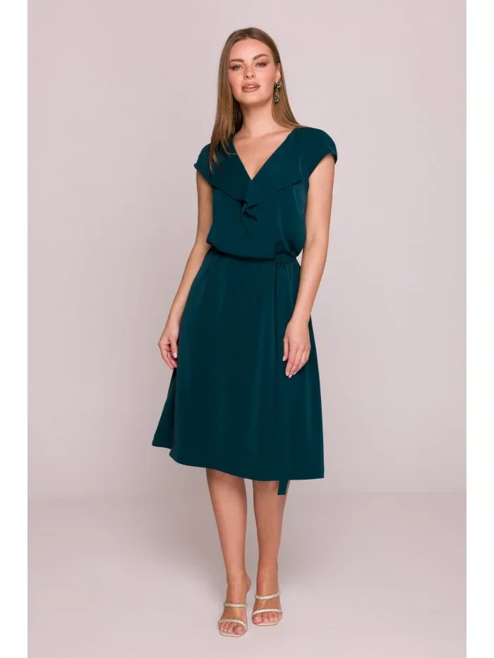 materiál: 95% polyester 5% elastan Materiál: hladká tkanina s jemným leskem PODROBNOSTI O PRODUKTU Výstřih: výstřih do V s ozdobným volánkem Rukávy: krátké, mírně spadlé Zapínání: skrytý boční zip Kapsy: žádné Podšívka: žádná Doplňky: látkový pásek na zavázání v pase Model: S411 Navrženo a vyrobeno v Polsku Modelka je vysoká 170 cm a má na sobě velikost S STYL A STŘIH Střih: mírně rozšířený směrem dolů Tvar: áčkový Délka: midi, pod kolena