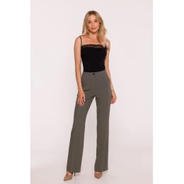 63% polyester 33% wiskoza 4% elastan LÁTKA Tkanina: hladká tkanina s měkkým povrchem PODROBNOSTI O PRODUKTU Pas: střední výška Zapínání: knoflík vpředu a skrytý zip Kapsy: boční kapsy Nohavice: dlouhé, rovné, s řasením Podšívka: žádná Model: S418 Navrženo a vyrobeno v Polsku Modelka je vysoká 174 cm a nosí velikost S STYL A STŘIH Styl: klasické kalhoty na míru Tvar: vypasované v pase a na bocích, rovné nohavice Délka: po celé délce, až na zem