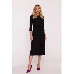 materiál: 95% polyester 5% elastan LÁTKA: hladká tkanina s jemným leskem PODROBNOSTI O PRODUKTU Výstřih: kulatý Rukávy: 3/4 délky Sukně: rovná, s ozdobným volánem podél boční linie sukně, vzadu vysoký rozparek Pas: zvýrazněný jemným střihem a látkovým překrytím Zapínání: skrytý zip na zádech Model: S425 Navrženo a vyrobeno v Polsku Modelka je vysoká 174 cm a nosí velikost S STYL A STŘIH Styl: elegantní koktejlové šaty s volánem Tvar: mírně vypasovaná silueta, rovná sukně zvýrazněná ozdobnými prvky Délka: midi - pod kolena