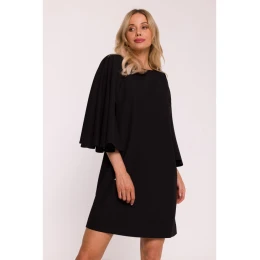 65% polyester 30% wiskoza 5% elastan LÁTKA: hladká tkanina PODROBNOSTI O PRODUKTU Výstřih: kulatý Rukávy: široké, rozšířené netopýří rukávy, 3/4 délka Sukně: rovná Pas: volný, bez střihu Zapínání: skrytý zip na zádech Model: S426 Navrženo a vyrobeno v Polsku Modelka je vysoká 174 cm a nosí velikost S STYL A STŘIH Styl: elegantní trapézové šaty s výraznými rukávy Tvar: volný top, rozšířené rukávy, rovná sukně Délka: mini - nad kolena