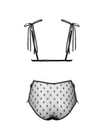 Průsvitný komplet sladce svázaný na bocích, vyrobený z jemného elastického tylu. Součástí je krásná podprsenka a kalhotky s vysokým pasem. Tkanina v roztomilých hvězdičkách - měkká, jako svůdný, smyslný voál... Ramínka sladce uvázaná na ramenou. Složení: 80 % polyamid, 20 % elastan.