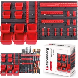 Je univerzální, obsahuje až 10 nádob se 3 různými kapacitami, sadu 16 držáků a závěsů různých velikostí, 2 police na nářadí a kolíky, 2 desky na nářadí, na které lze všechny tyto organizéry zavěsit.