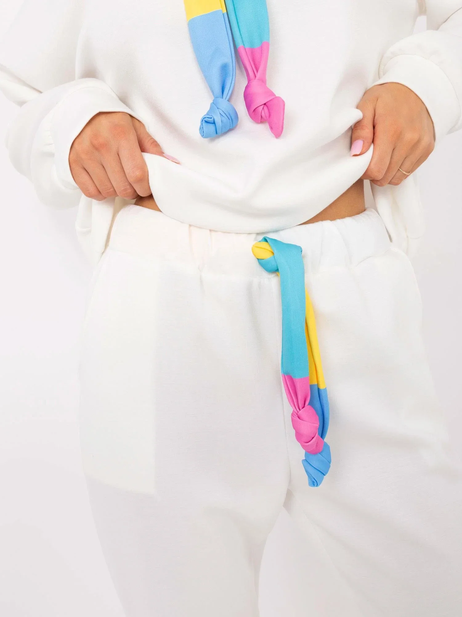 Rozměry kalhot v jedné velikosti: šířka v pase - 35 cm (na plocho), šířka v pase - 65 cm (při natažení), výška v pase - 31 cm, celková délka - 94 cm.