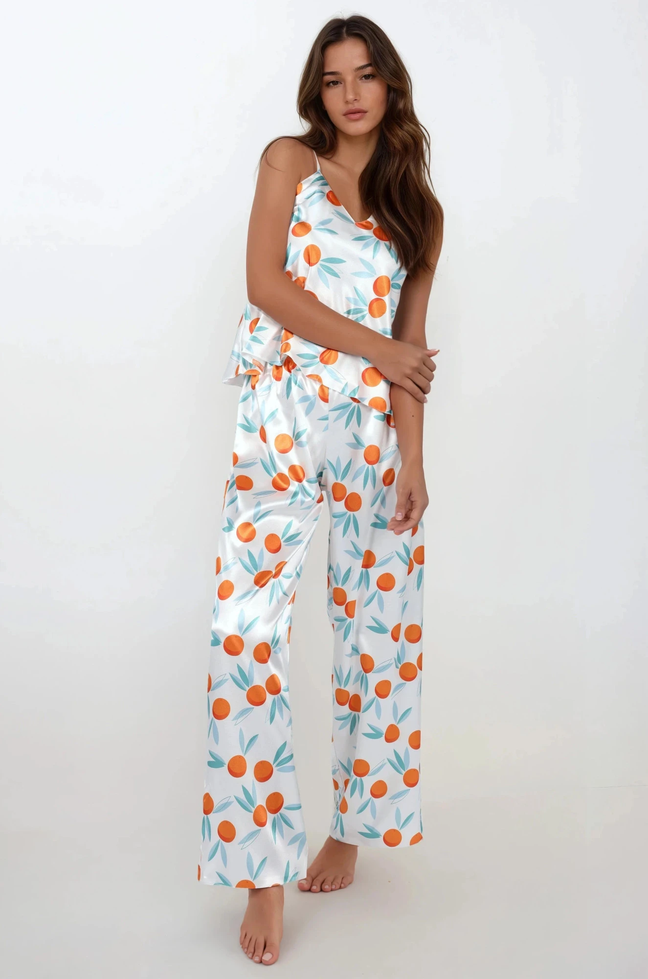 Pohodlné dvoudílné pyžamo z měkkého saténu s potiskem. Navrženo tak, aby zdůrazňovalo linii poprsí, okouzluje jemným výstřihem a krásnými tenkými ramínky, jejichž délku lze nastavit. Dlouhé kalhoty s pohodlnými nohavicemi, v pase na měkkou gumu. Složení: 100% polyester.