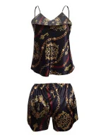 Saténový komplet s halenkou na tenkých, nastavitelných ramínkách, s kraťásky, díky nimž budou vaše stehna a boky vypadat sexy... Může být něco smyslnějšího a pohodlnějšího? Satén zdůrazněný krásným, zajímavým vzorem je opravdovým poutačem na oči. Kraťásky na měkkém elastickém pásku. Návrh, který se osvědčí bez ohledu na roční období. Složení: 100% polyester.
