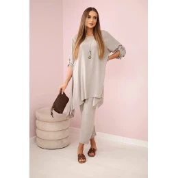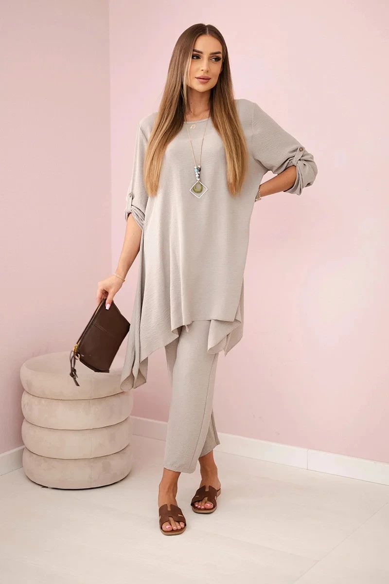 Italská dvoudílná souprava skládající se z rozšířené halenky a kalhot je elegantní souprava, která dodá kouzlo a styl každému stylu. Rozevlátá halenka dodává jemnou ženskost, zvýrazňuje postavu a zároveň zajišťuje volnost pohybu. Klasický střih kalhot dokonale ladí s elegantní halenkou a tvoří tak ucelený a stylový celek. Přívěsek ve tvaru klíče je navíc okouzlujícím detailem, který dodává této sadě originalitu a charakter a vytváří harmonickou kompozici. Jde o elegantní doplněk, který zdůrazňuje jedinečnost a smysl pro detail v celém stylingu. Tato italská souprava je ideální pro mnoho příležitostí, od obchodních schůzek až po romantická rande. Toto je rafinovaná volba pro lidi, kteří oceňují eleganci a pohodlí v jednom. Velikost je univerzální a padne ženám, které nosí velikost S, M nebo L.