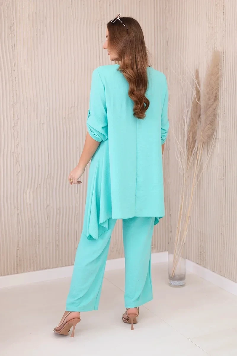 Italská dvoudílná souprava skládající se z rozšířené halenky a kalhot je elegantní souprava, která dodá kouzlo a styl každému stylu. Rozevlátá halenka dodává jemnou ženskost, zvýrazňuje postavu a zároveň zajišťuje volnost pohybu. Klasický střih kalhot dokonale ladí s elegantní halenkou a tvoří tak ucelený a stylový celek. Přívěsek ve tvaru klíče je navíc okouzlujícím detailem, který dodává této sadě originalitu a charakter a vytváří harmonickou kompozici. Jde o elegantní doplněk, který zdůrazňuje jedinečnost a smysl pro detail v celém stylingu. Tato italská souprava je ideální pro mnoho příležitostí, od obchodních schůzek až po romantická rande. Toto je rafinovaná volba pro lidi, kteří oceňují eleganci a pohodlí v jednom. Velikost je univerzální a padne ženám, které nosí velikost S, M nebo L.