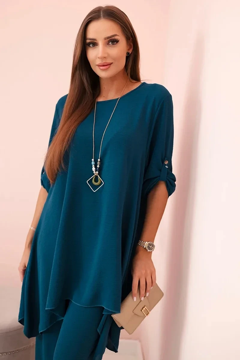 Italská dvoudílná souprava skládající se z rozšířené halenky a kalhot je elegantní souprava, která dodá kouzlo a styl každému stylu. Rozevlátá halenka dodává jemnou ženskost, zvýrazňuje postavu a zároveň zajišťuje volnost pohybu. Klasický střih kalhot dokonale ladí s elegantní halenkou a tvoří tak ucelený a stylový celek. Přívěsek ve tvaru klíče je navíc okouzlujícím detailem, který dodává této sadě originalitu a charakter a vytváří harmonickou kompozici. Jde o elegantní doplněk, který zdůrazňuje jedinečnost a smysl pro detail v celém stylingu. Tato italská souprava je ideální pro mnoho příležitostí, od obchodních schůzek až po romantická rande. Toto je rafinovaná volba pro lidi, kteří oceňují eleganci a pohodlí v jednom. Velikost je univerzální a padne ženám, které nosí velikost S, M nebo L.