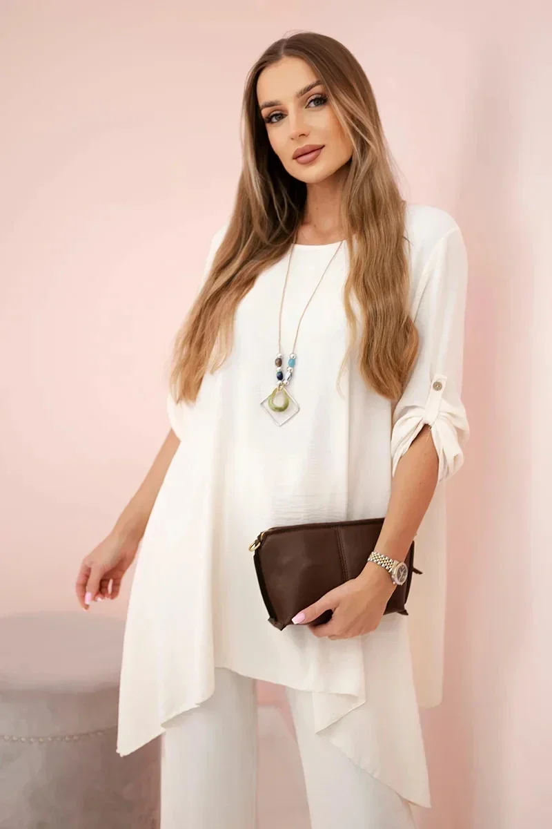 Italská dvoudílná souprava skládající se z rozšířené halenky a kalhot je elegantní souprava, která dodá kouzlo a styl každému stylu. Rozevlátá halenka dodává jemnou ženskost, zvýrazňuje postavu a zároveň zajišťuje volnost pohybu. Klasický střih kalhot dokonale ladí s elegantní halenkou a tvoří tak ucelený a stylový celek. Přívěsek ve tvaru klíče je navíc okouzlujícím detailem, který dodává této sadě originalitu a charakter a vytváří harmonickou kompozici. Jde o elegantní doplněk, který zdůrazňuje jedinečnost a smysl pro detail v celém stylingu. Tato italská souprava je ideální pro mnoho příležitostí, od obchodních schůzek až po romantická rande. Toto je rafinovaná volba pro lidi, kteří oceňují eleganci a pohodlí v jednom. Velikost je univerzální a padne ženám, které nosí velikost S, M nebo L.
