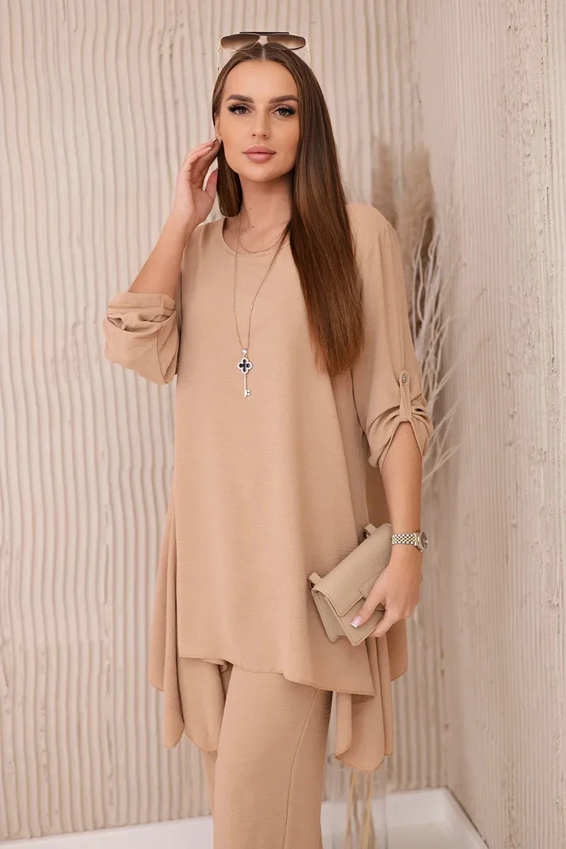 Italská dvoudílná souprava skládající se z rozšířené halenky a kalhot je elegantní souprava, která dodá kouzlo a styl každému stylu. Rozevlátá halenka dodává jemnou ženskost, zvýrazňuje postavu a zároveň zajišťuje volnost pohybu. Klasický střih kalhot dokonale ladí s elegantní halenkou a tvoří tak ucelený a stylový celek. Přívěsek ve tvaru klíče je navíc okouzlujícím detailem, který dodává této sadě originalitu a charakter a vytváří harmonickou kompozici. Jde o elegantní doplněk, který zdůrazňuje jedinečnost a smysl pro detail v celém stylingu. Tato italská souprava je ideální pro mnoho příležitostí, od obchodních schůzek až po romantická rande. Toto je rafinovaná volba pro lidi, kteří oceňují eleganci a pohodlí v jednom. Velikost je univerzální a padne ženám, které nosí velikost S, M nebo L.