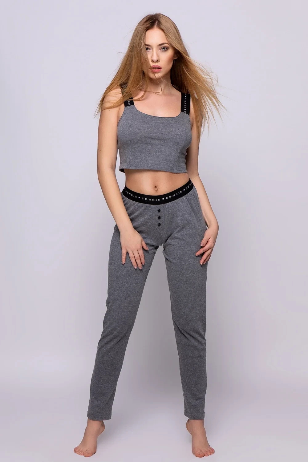 Šedá dvoudílná sada s výraznými černými gumičkami. Ideální jako sexy domácí oblečení nebo pyžamo. Halenka v podobě krátkého módního topu se zajímavými širšími ramínky. Dlouhé, pohodlné kalhoty s viditelným elastickým pasem, který je stejně jako ramínka pokrytý potiskem. Ozdobné knoflíky na přední straně. Nejnovější kolekce Sensis.