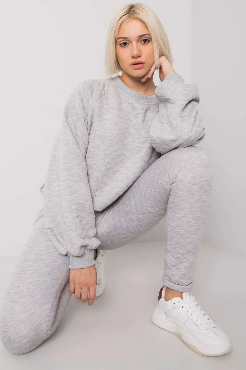Prošívaná tepláková souprava sestávající z mikiny a kalhot. Mikina s dlouhým rukávem bez kapuce. Tepláky se zavazováním v pase a nakládanými kapsami.