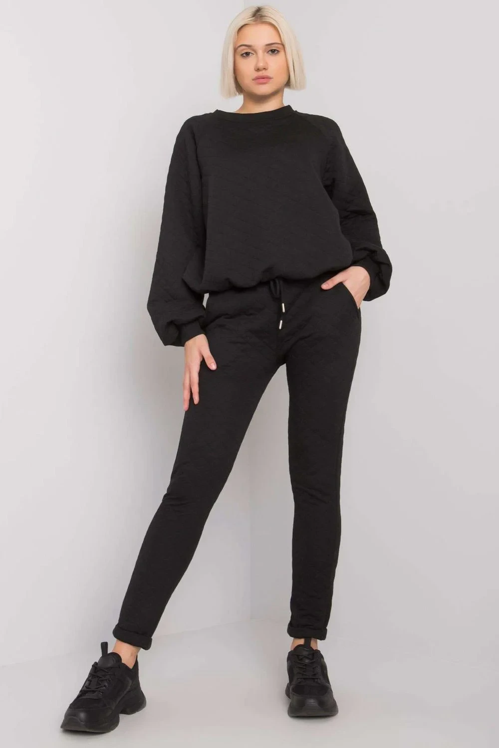 Prošívaná tepláková souprava sestávající z mikiny a kalhot. Mikina s dlouhým rukávem bez kapuce. Tepláky se zavazováním v pase a nakládanými kapsami.