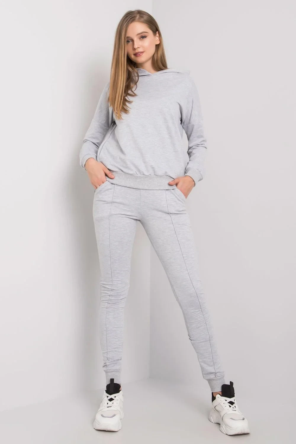 Tepláková souprava sestávající z mikiny a kalhot. Mikina s dlouhými rukávy, kapucí, kapsami a ozdobným zipem na zádech. Kalhoty s nakládanými kapsami.