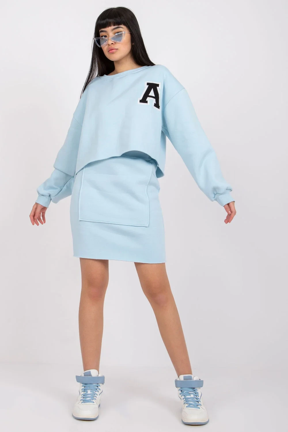 Souprava se skládá z halenky a sukně. Halenka s dlouhými rukávy a tištěným nápisem na přední straně. Sukně tužkového střihu s žebrovaným pasem.