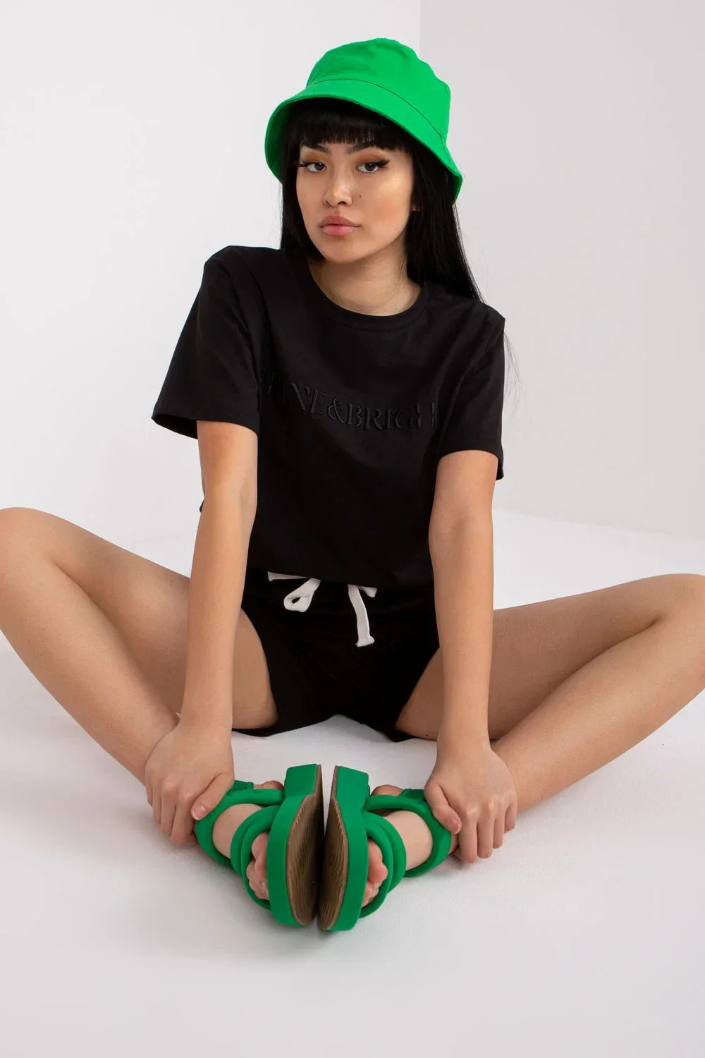 Souprava se skládá z halenky a šortek. Halenka s krátkými rukávy, nápis na přední straně. Šortky s páskem na zavazování, boční šikmé kapsy.
