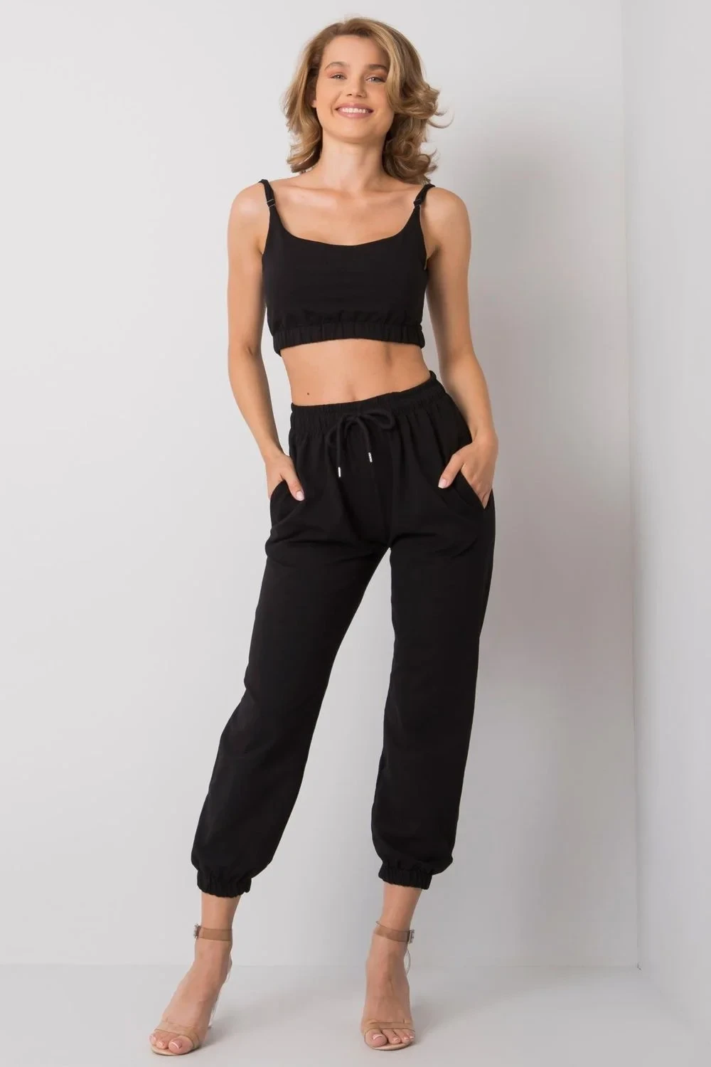 Sportovní souprava složená z topu a tepláků. Top s nastavitelnými ramenními popruhy. Tepláky s elastickým pasem a vázáním, boční šikmé kapsy.