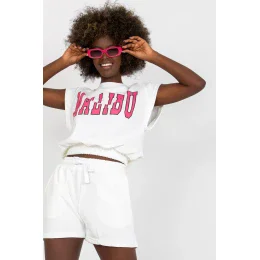 Tepláková souprava sestávající z halenky a šortek. Halenka s krátkými rukávy, kulatý výstřih, nápis na přední straně. Šortky s vysokým pasem a kapsami na bocích. Šortky s elastickým pasem, zavazování na šňůrku.