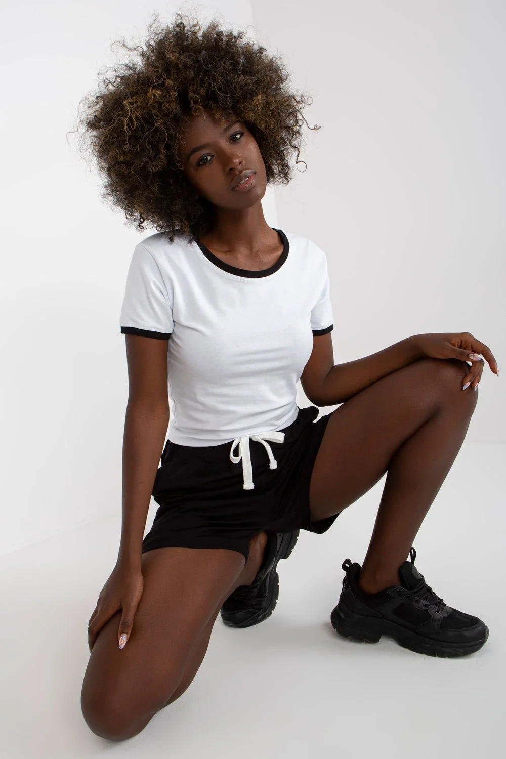 Dámská souprava se skládá z trička a šortek. Tričko s krátkými rukávy a kulatým výstřihem. Šortky s vysokým pasem a kapsami na bocích. Šortky s elastickým pasem a vázáním.