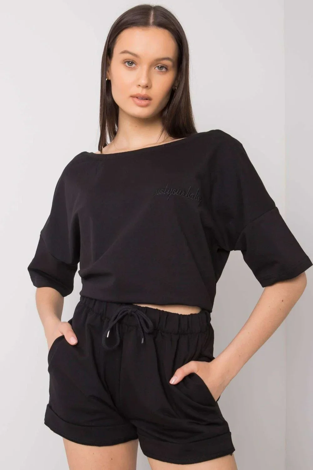 Bavlněná souprava sestávající z halenky a šortek. Halenka volného střihu s krátkými rukávy. Šortky s gumou a zavazováním v pase. Kapsy na bocích.