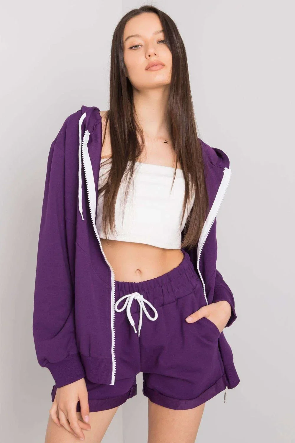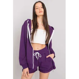 Tepláková souprava sestávající z mikiny a šortek. Mikina se zipem a kapucí. Šortky s gumou a zavazováním v pase, boční kapsy.