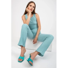 Souprava se skládá z topu a dlouhých kalhot. Krátký top s kulatým výstřihem. Dlouhé kalhoty s vysokým sedem a rovnými nohavicemi, v pase na gumu. Celek je vyroben ze široké žebrované tkaniny.