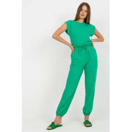 Letní souprava sestávající z halenky a dlouhých kalhot. Halenka klasického střihu se zapínáním u krku. Dlouhé kalhoty s pružným pasem a vázáním, s kapsami na bocích.