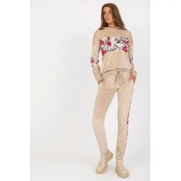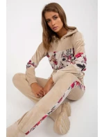 Velurová souprava sestávající z mikiny a dlouhých kalhot. Halenka s dlouhými rukávy a kapucí. Dlouhé kalhoty se zavazováním v pase a nakládanými kapsami. Sada s dekorativními květinovými vložkami.