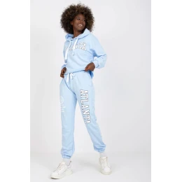 Tepláková souprava sestávající z mikiny a kalhot. Mikina s dlouhými rukávy a kapucí. Dlouhé kalhoty s vysokým pasem, elastickým pasem a vázáním, s kapsami na bocích.