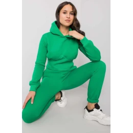 Dámská tepláková souprava sestávající z mikiny a kalhot. Krátká mikina s dlouhými rukávy a kapucí. Dlouhé kalhoty se zavazováním v pase a nakládanými kapsami.