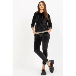 Dámská velurová souprava sestávající z mikiny a kalhot. Halenka s 3/4 rukávy a kapucí. Dlouhé kalhoty se zavazováním v pase a nakládanými kapsami. Souprava je zakončena žebrovanými manžetami s ozdobným potiskem.