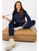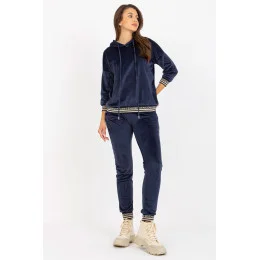 Dámská velurová souprava sestávající z mikiny a kalhot. Halenka s 3/4 rukávy a kapucí. Dlouhé kalhoty se zavazováním v pase a nakládanými kapsami. Souprava je zakončena žebrovanými manžetami s ozdobným potiskem.