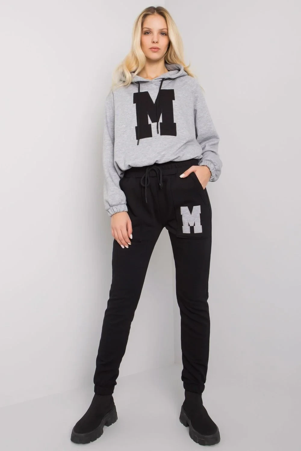 Tepláková souprava sestávající z mikiny a kalhot. Krátká mikina s dlouhými rukávy a kapucí. Dlouhé kalhoty se zavazováním v pase a nakládanými kapsami.
